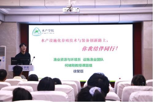 博士生徐聚臣介绍了学院在水产设施化养殖方面的卓越成果,其中零排放绿色高效养殖技术入选农业农村部重大农业新技术名录,斩获多项科技奖励与发明专利。