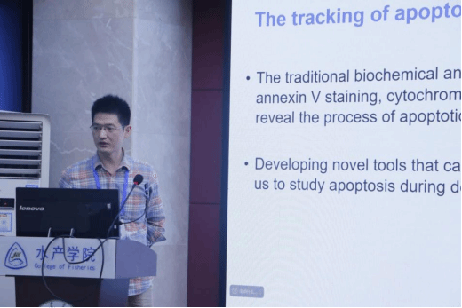 贾皓博士带来“细胞凋亡可视化探针斑马鱼”的创新研究。他构建基于荧光共振能量转移(FRET)的凋亡传感器“Sensor C3”,通过“绿→蓝”的荧光变化实现凋亡可视化标记:利用krt4启动子可实现皮肤细胞特异性监测,UV照射后荧光快速变蓝;借助ubi启动子则能捕捉心脏、神经元等全身组织的凋亡动态,甚至观察到运动神经元“细胞体与轴突同步变蓝”的过程。该模型对重金属镉的检测限低至4.4nM,较传统检测提前48小时预警毒性损伤,还颠覆“巨噬细胞主导凋亡清除”的认知,发现斑马鱼卵黄囊上皮细胞早期凋亡主要由相邻细胞吞噬。
