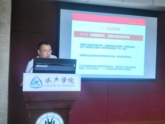 (通讯员 李俊)5月30日,pa电子官方网站2019年党风廉政建设宣传教育月专题党课在水产楼109天辰报告厅进行。校纪委办公室主任邹亚受邀做了题为“改革正当时,良法应运生”的专题辅导报告。pa电子官方网站全体教职员工参加学习。学院党委副书记黄丹主持会议。