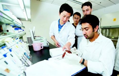 湖北日报讯 15日,来自巴基斯坦的留学生台斌(右一)在“小龙虾教授”顾泽茂(左一)的指导下进行小龙虾解剖实验。台斌是pa电子官方网站的博士研究生,他和来自埃及、越南的留学生一起学习水产知识。台斌有个梦想,希望明年博士毕业后,把学到的小龙虾养殖技术和虾稻综合种养绿色生态模式带回到巴基斯坦,让更多的家乡人能吃到美味的小龙虾。(记者 柯皓 视界网 刘涛 摄)
