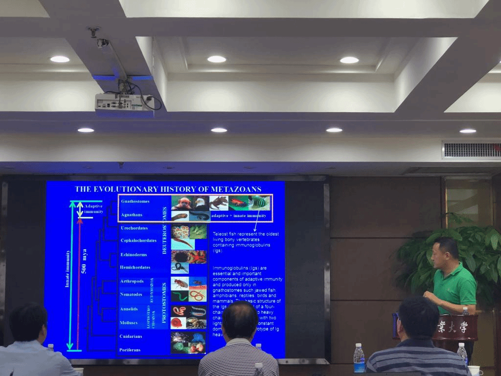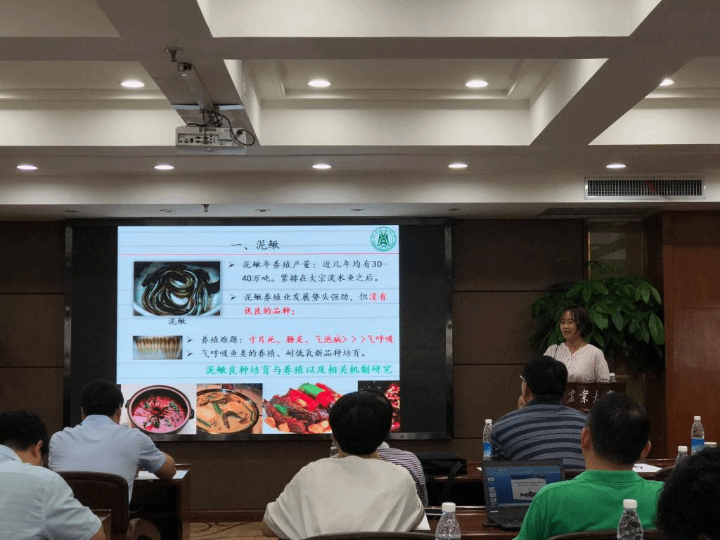 曹小娟副教授讲了“泥鳅良种培育与养殖及相关机制研究进展”。通过选育制备获得多种具有优良生长性状和肉质品质的泥鳅育种材料,从养殖到基因敲除到蛋白质组学,系统地讲述了泥鳅良种培育和养殖的内容。徐镇教授作了题为“The swimbladder plays a previously unrecognized new function in mucosal immunity”的报告,提供了对于黏膜免疫防御机制进化起源的最新见解,即硬骨鱼类肠、鳃和皮肤都可以产生抗寄生虫免疫应答,他的近期研究发现了鱼鳔在粘膜免疫中也发挥重要作用,其缜密的科研思维、系统而深入的研究以及研究成果的展示得到了在座专家的交口称赞。刘春生教授讲了“水体污染物TDCIPP的水生态毒理学研究新进展”,揭示TDCIPP通过干扰生长轴引起发育繁殖毒性,发现TDCIPP抑制大型溞个体发育和幼溞产量,揭示了TDCIPP对大型溞的致毒机制,同时揭示了内质网应激介导的多代毒性机制。罗智教授带来了“矿物盐对鱼类脂肪沉积和代谢影响研究新进展”,从独到的角度开展营养饲料的研究。