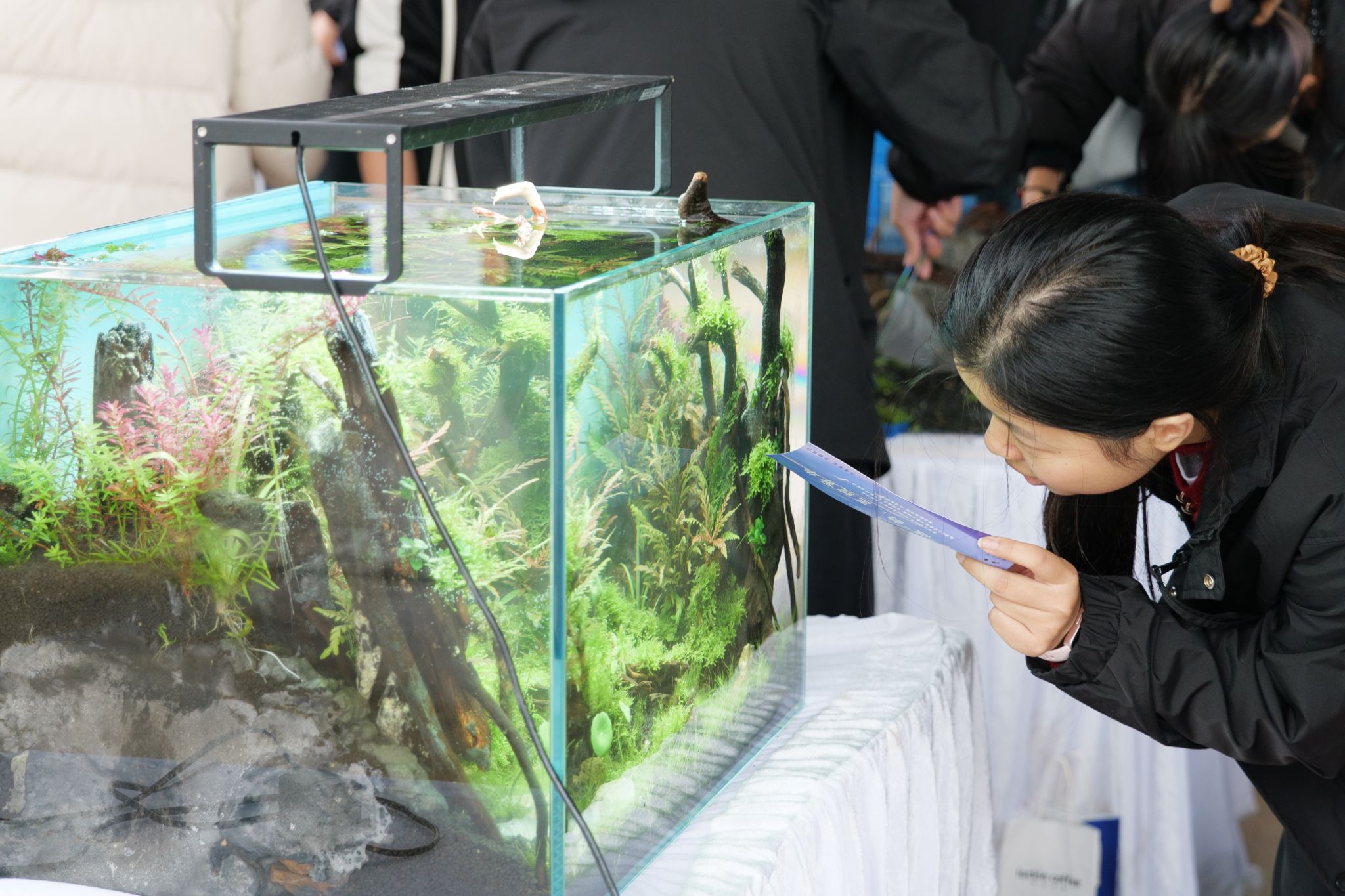 水族造景大赛延续“水中江山亦多娇”,以专业技能展呈现水下景致。参赛同学运用水草、沉木、石子等不同材料,设计出风格迥异却精致美观的“小景观”。现场氛围热情洋溢,创意碰撞交织,选手们分工协作,依照自己的思路打造出一个个美丽的水下世界。