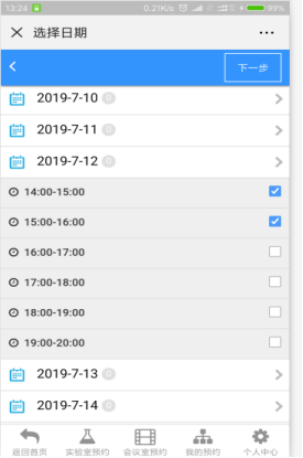 选择实验室内的工位,点击下一步,录入实验室预约的基本信息。