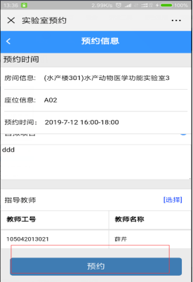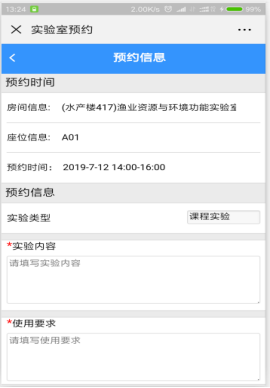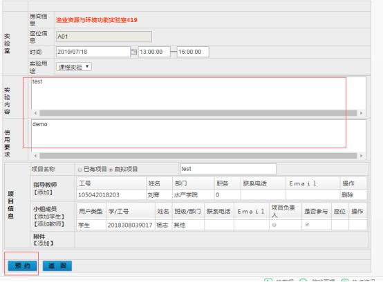 根据提示,录入实验室内容、使用要求、项目名称、指导老师等信息,点击【预约】即可。