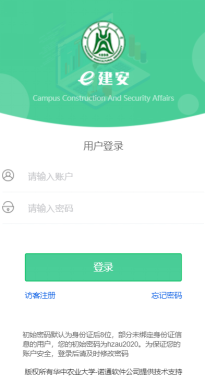 关注微信公众号“e建安”,点击“我的业务”注册。教职工通过工号注册,密码为8位数生日;学校聘用人员通过工号注册,密码为hzau2020;常驻人口、经商、外来人员通过“访客注册”,自行设定8位数由字母和数字组成的密码,首位密码为字母且大写。