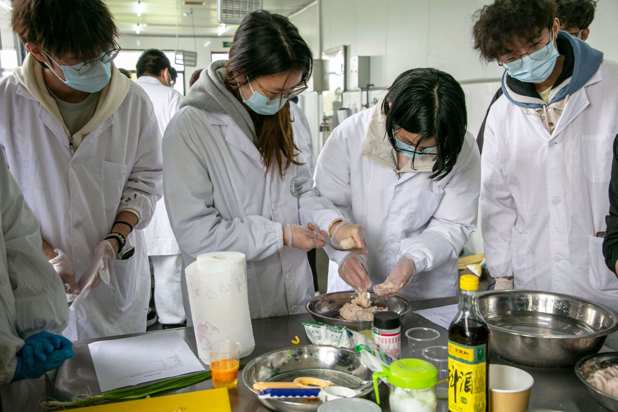 同学们将解冻好的巴沙鱼柳放入绞肉机中打碎,再依次添加食盐、土豆淀粉、料酒等调味料进行擂溃,至鱼糜在水中可以浮起。在擂溃搅拌过程中,大家齐心协力,控制好温度,让鱼糜呈现出良好的状态,便于后续掐制鱼丸。张秀杰老师手把手向同学们展示了鱼丸的制作方法,为大家掐制出一个个精美的鱼丸。