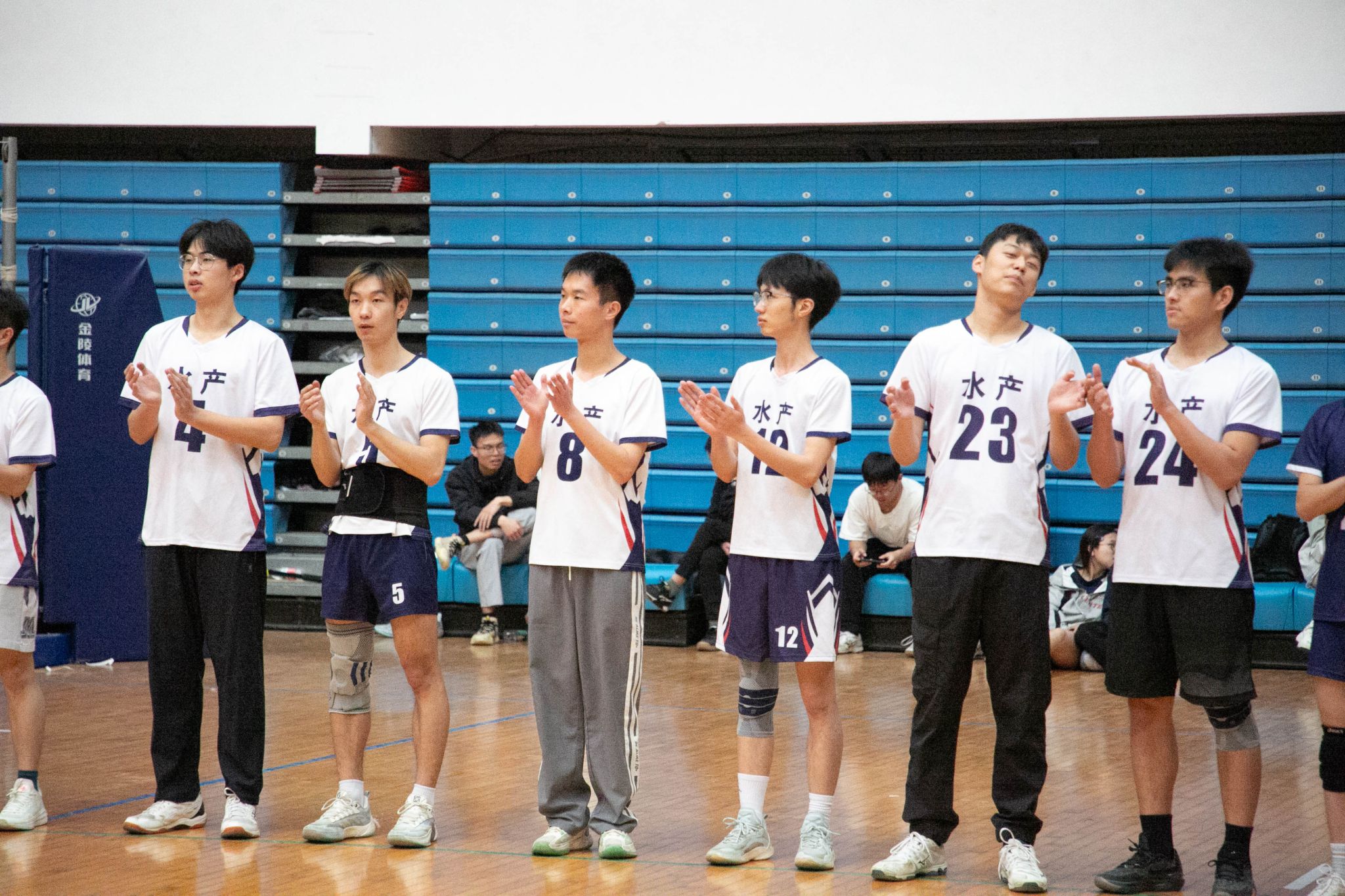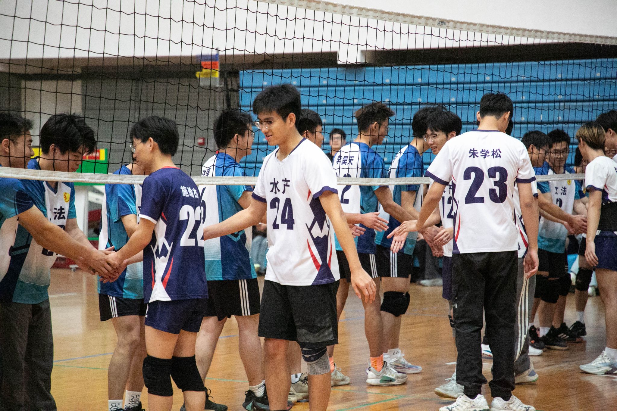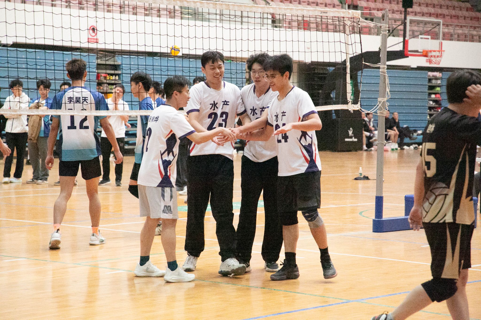 水产男排开局强势发力,张浩宇以一记斜线暴扣斩获首分,黎浩宇连续跳飘发球助队伍3-0占得先机。文法男排凭借严密拦防将比分反超至11-10,关键时刻张栩烨机智吊球扳平战局。双方胶着对抗至局末,水产男排以25-23力克对手,成功拿下首局胜利。