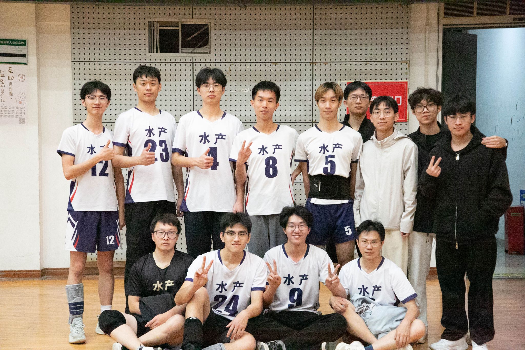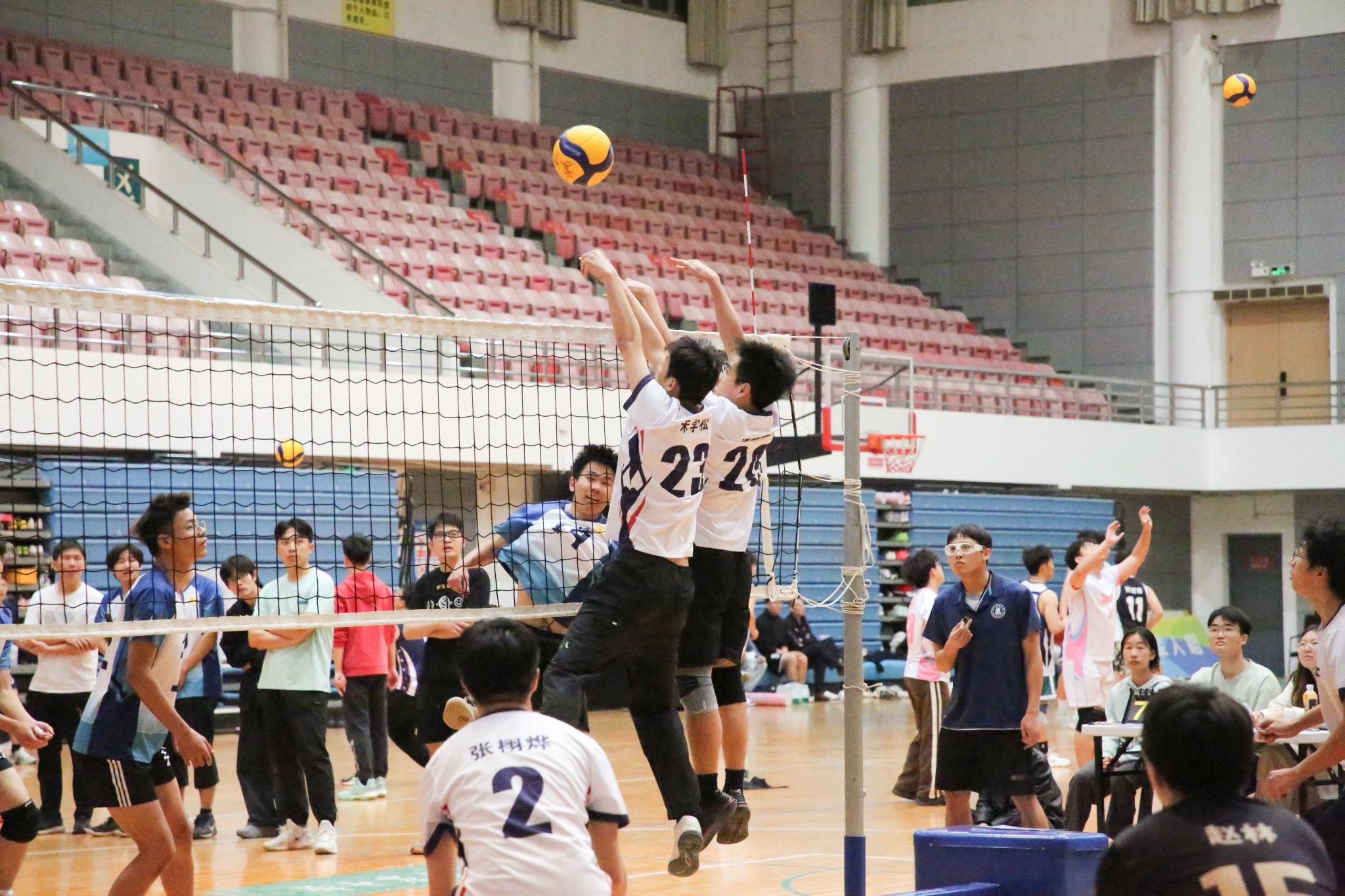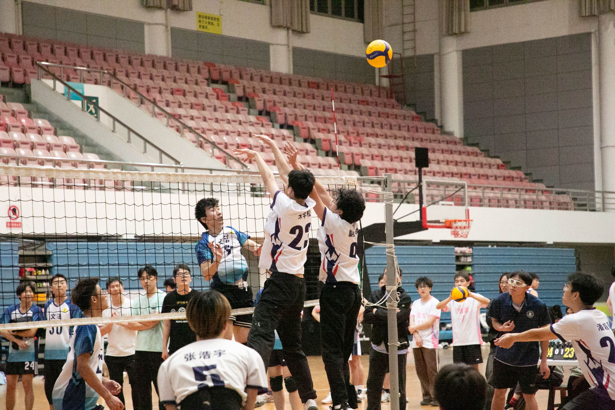 水产男排开局强势发力,张浩宇以一记斜线暴扣斩获首分,黎浩宇连续跳飘发球助队伍3-0占得先机。文法男排凭借严密拦防将比分反超至11-10,关键时刻张栩烨机智吊球扳平战局。双方胶着对抗至局末,水产男排以25-23力克对手,成功拿下首局胜利。