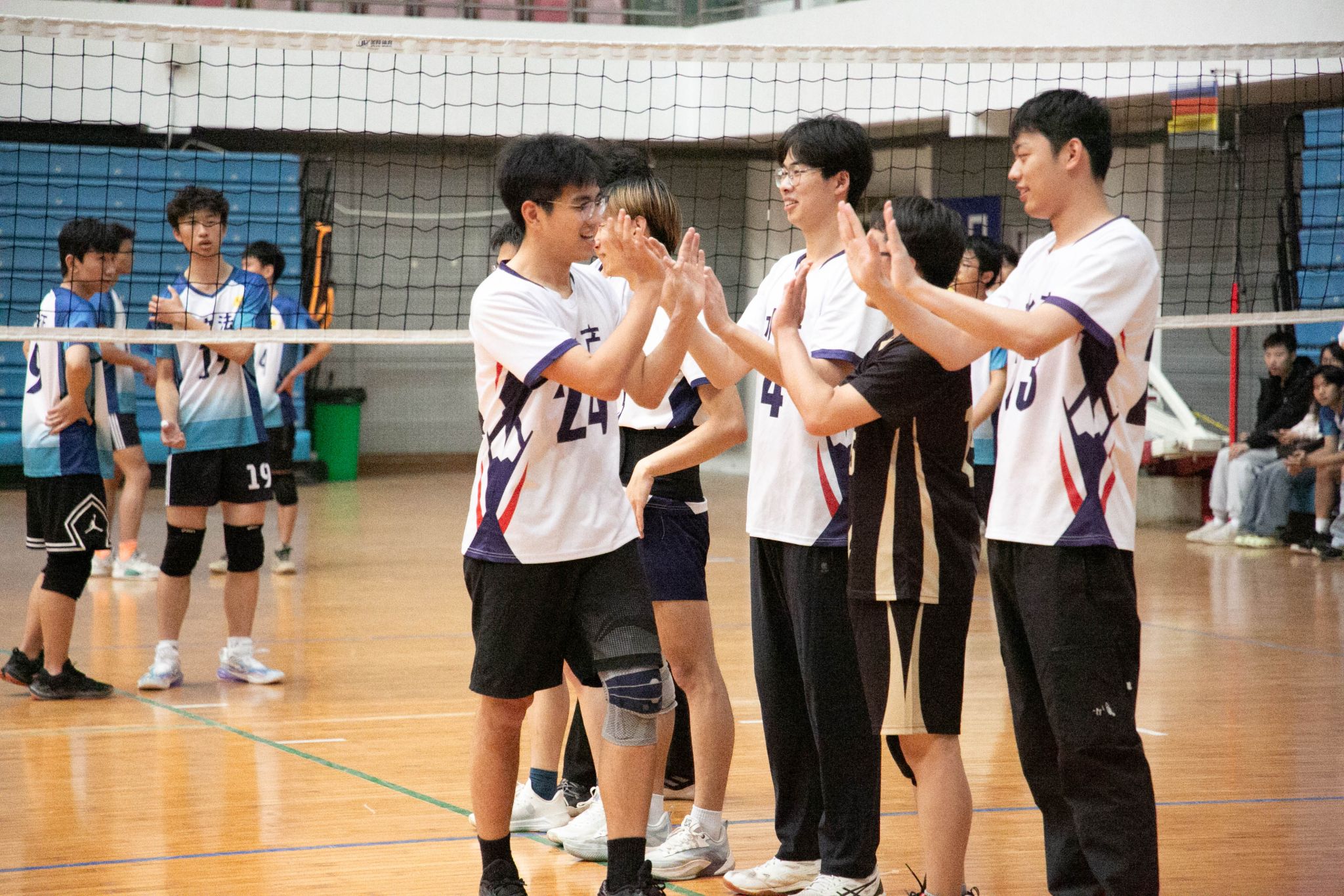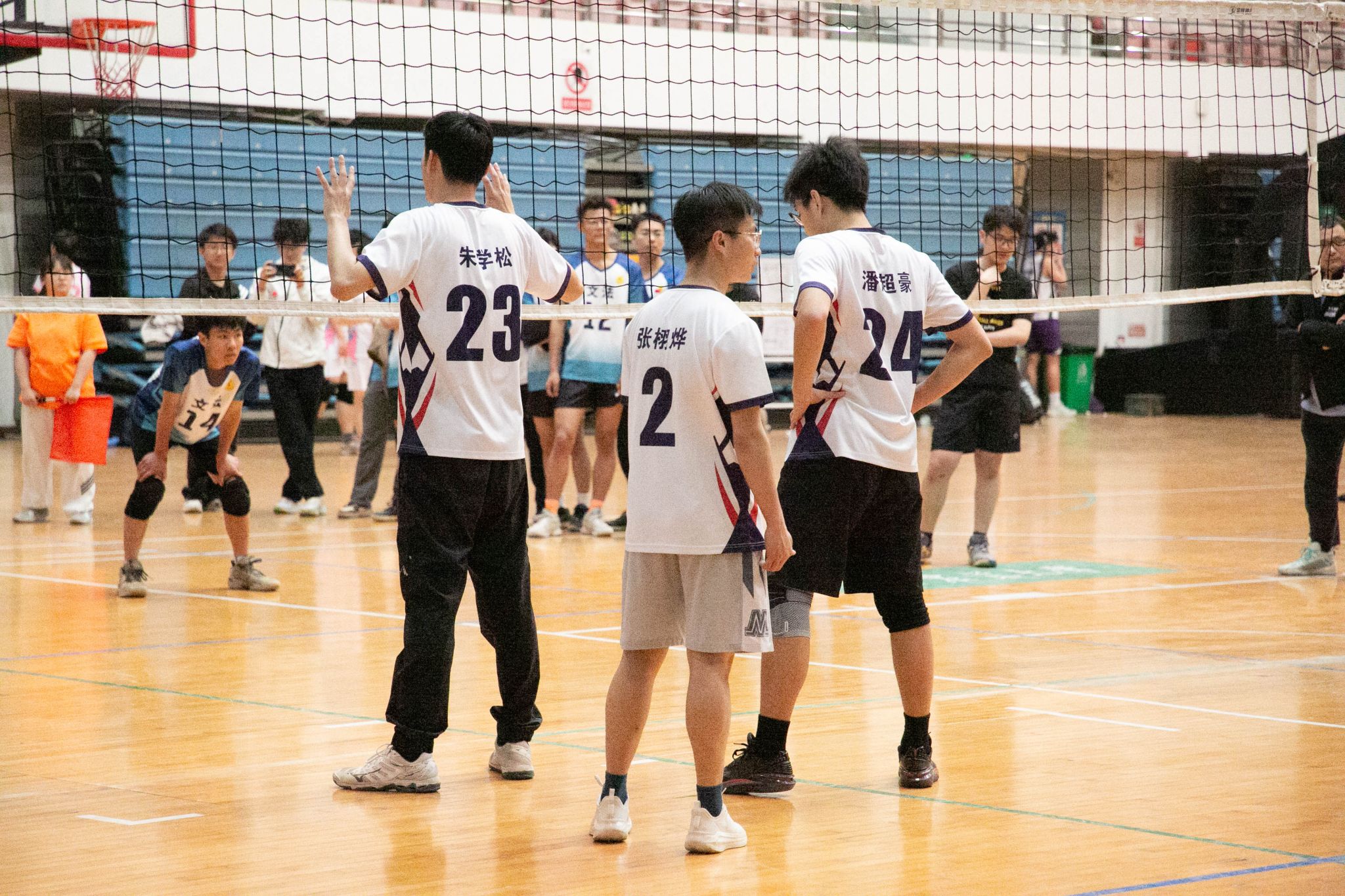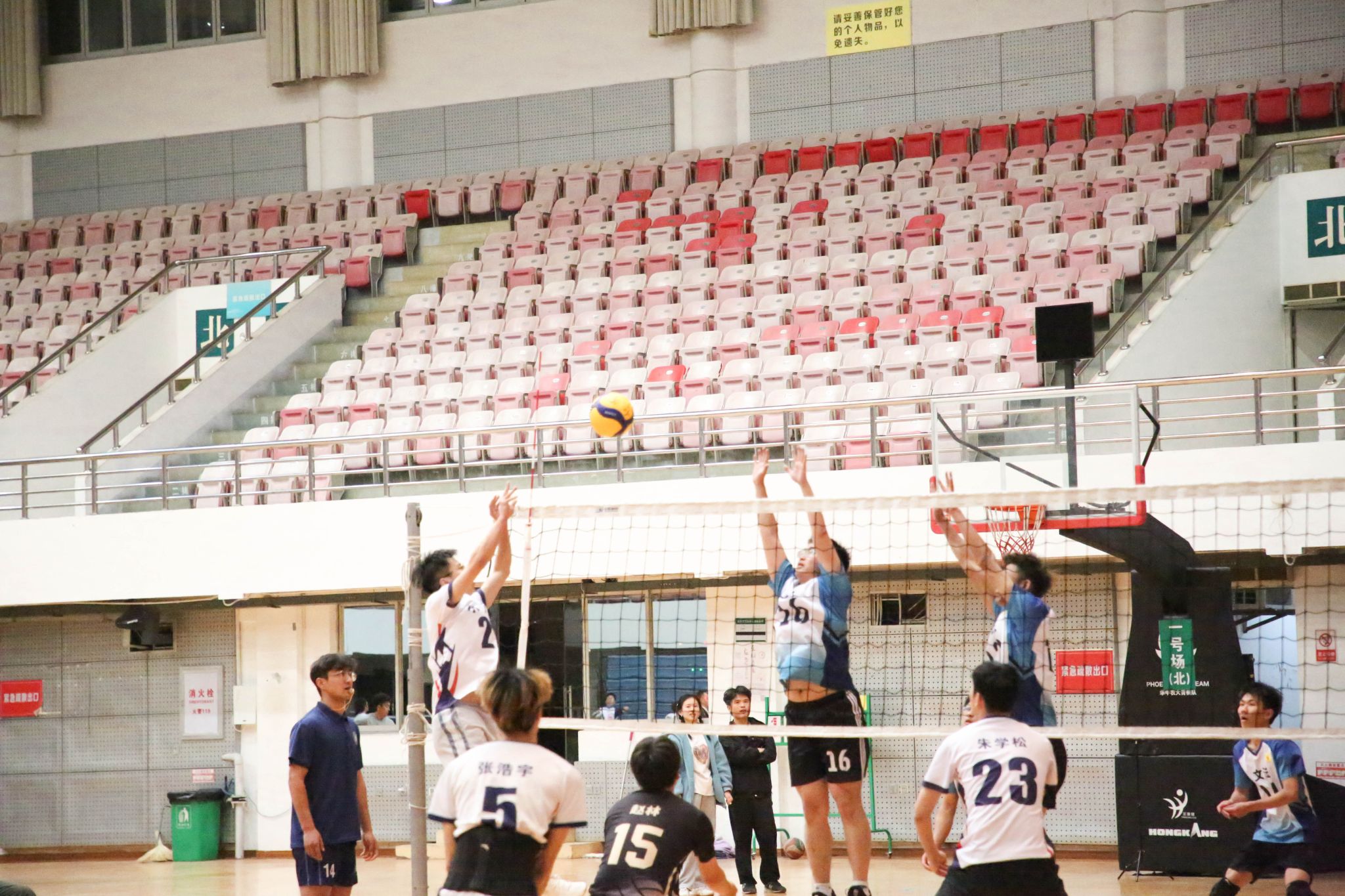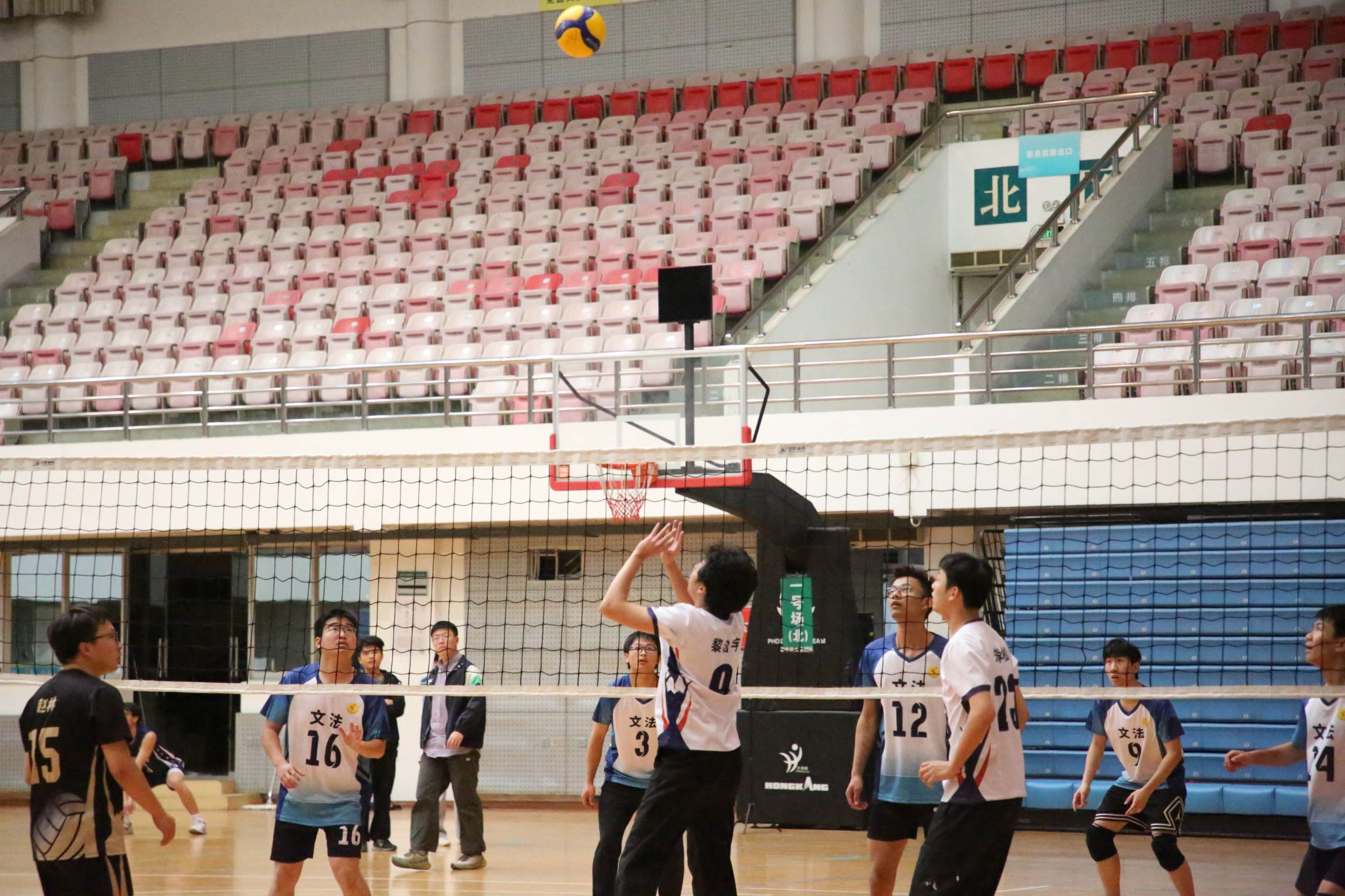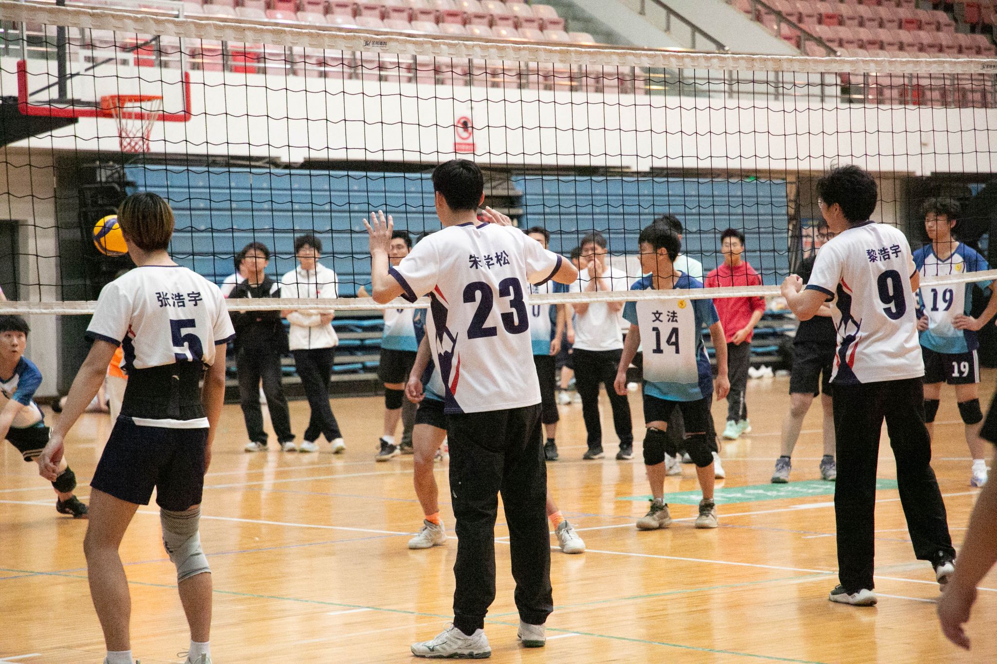 4月12日19点,pa电子官方网站2024年狮子山杯排球赛男子组5、6排位赛,于西体育馆顺利举行。本次交手的两支队伍分别来自pa电子官方网站和文法学院,主持人依次介绍双方队员及裁判员,双方球员握手致意。