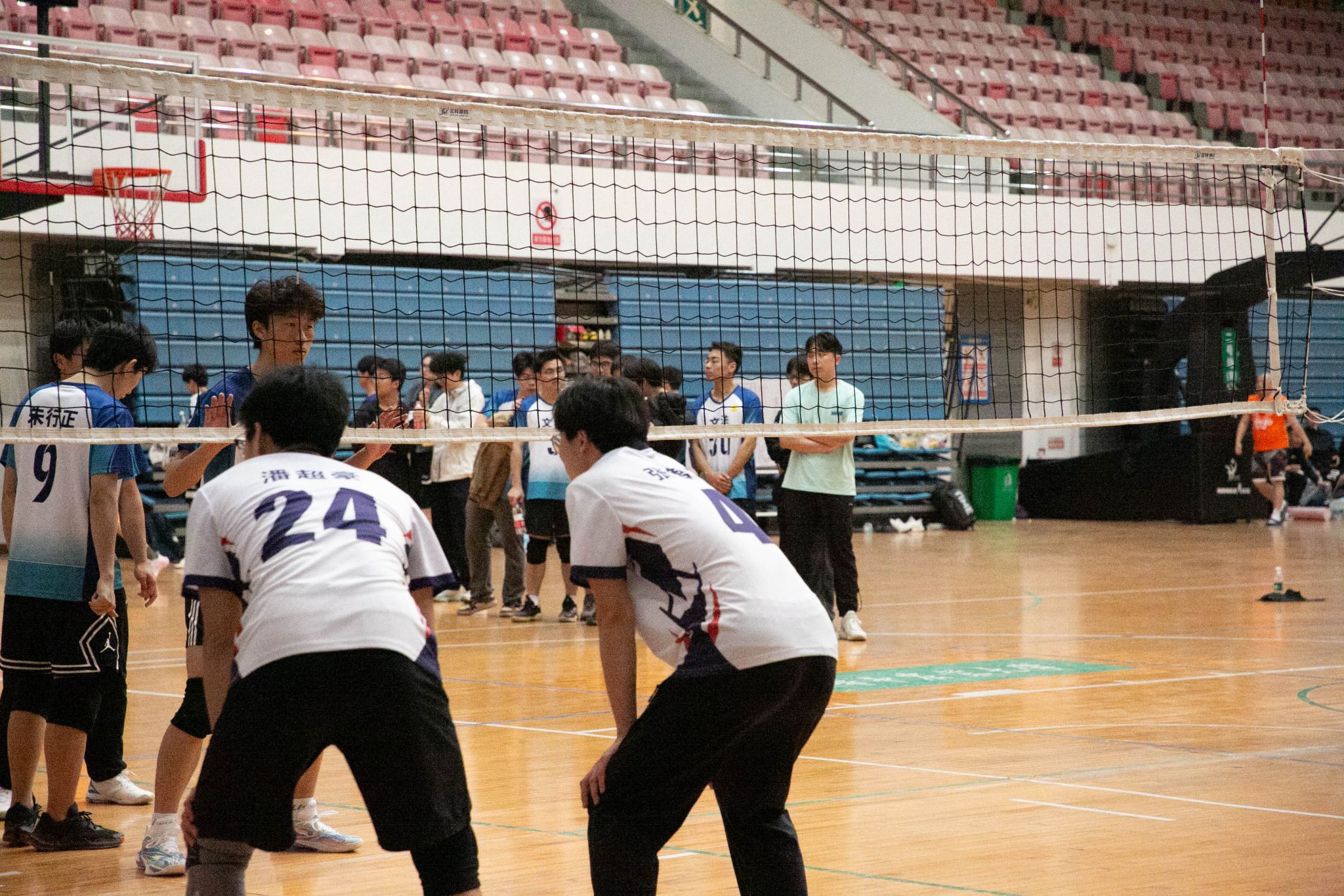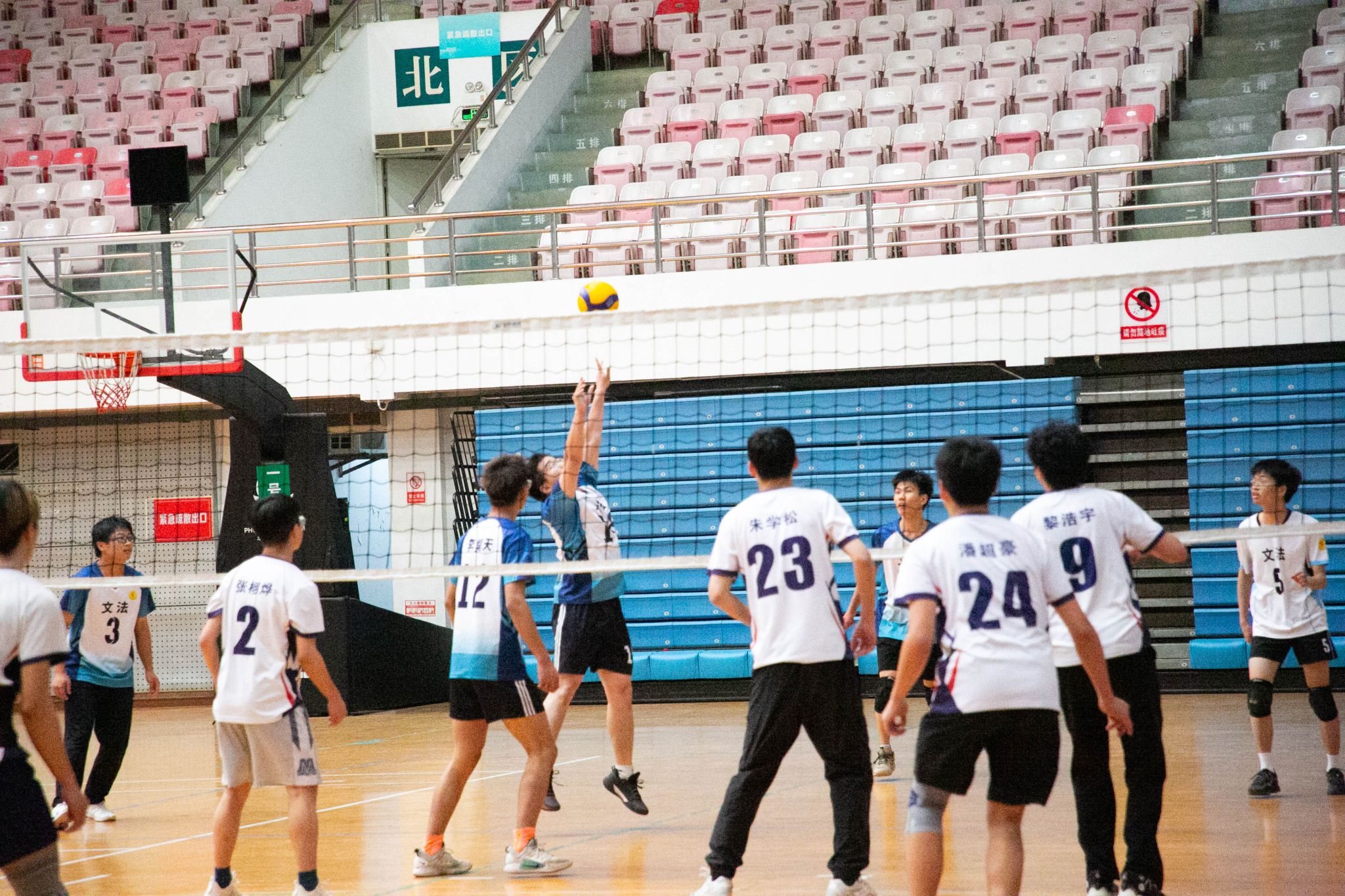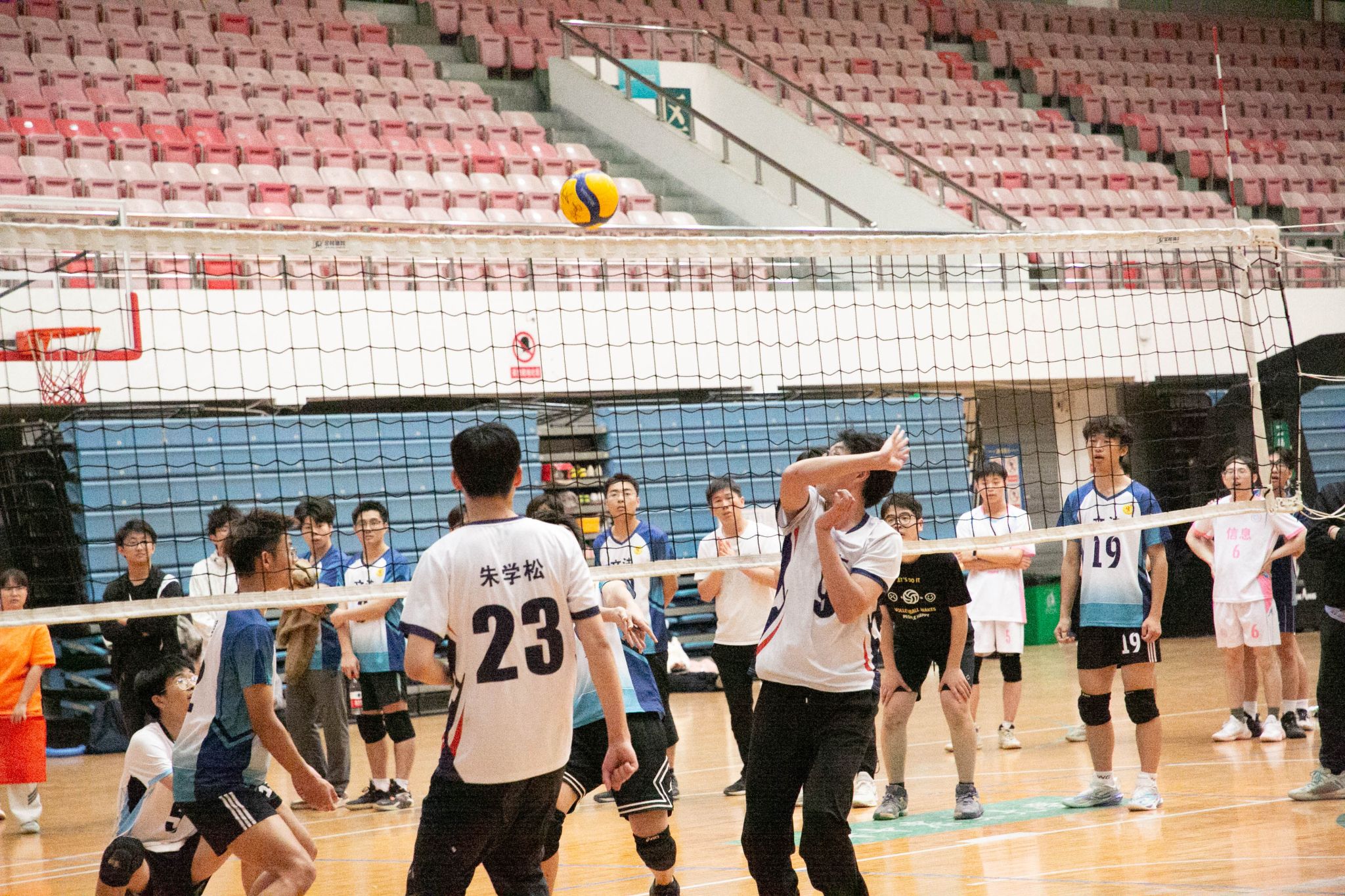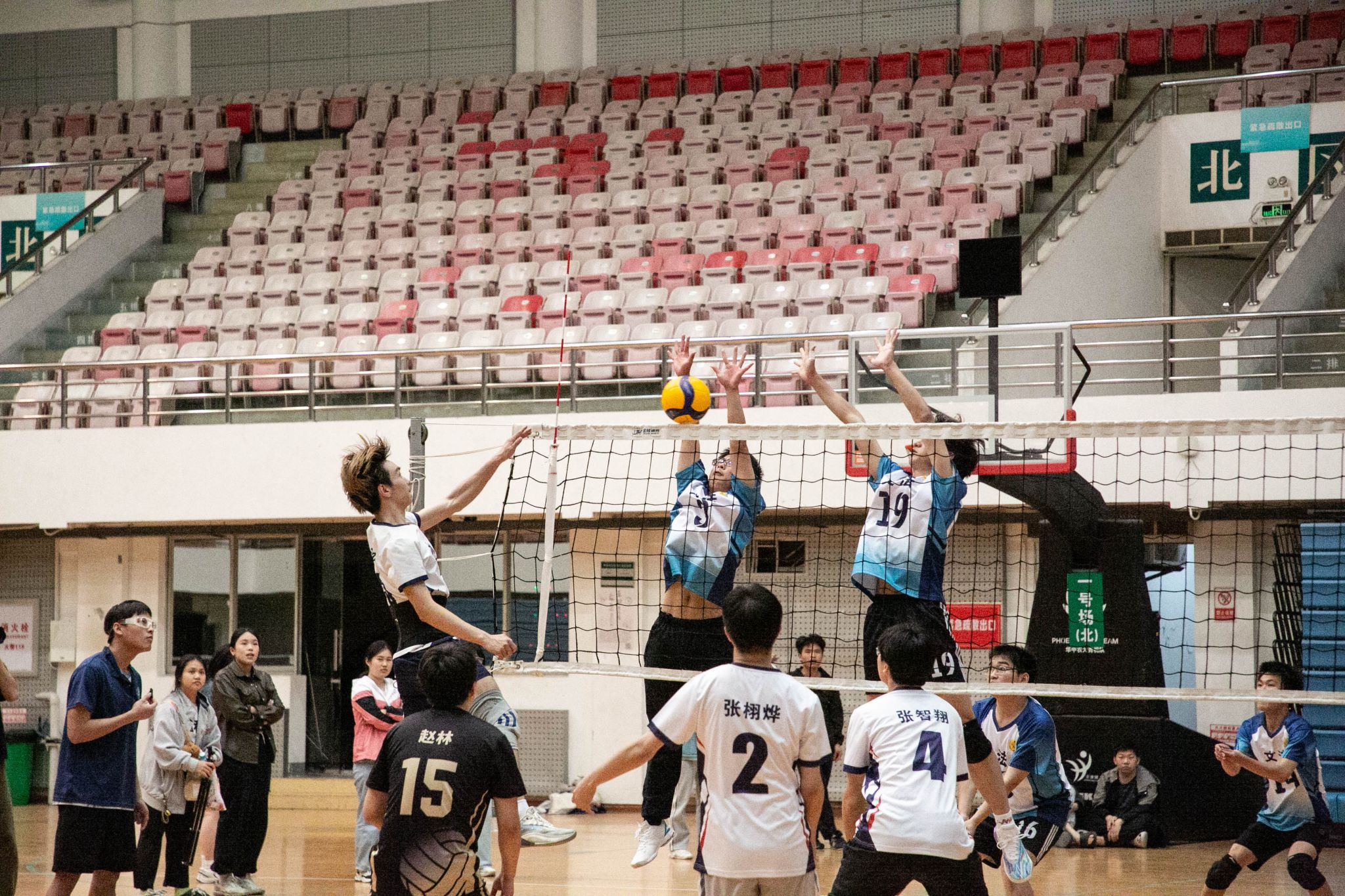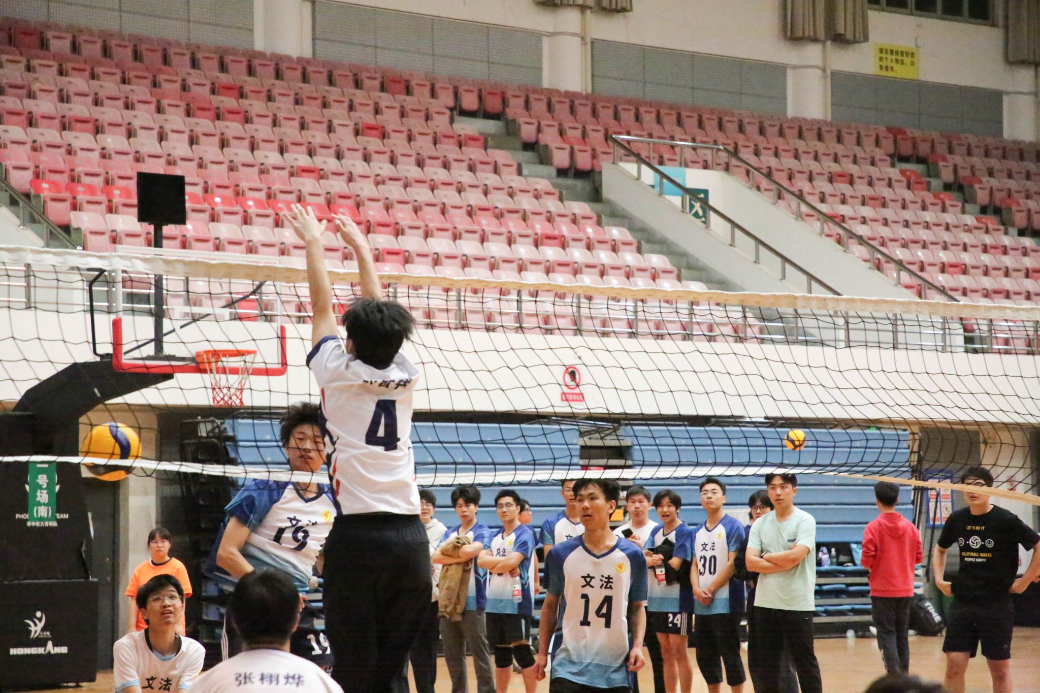 4月12日19点,pa电子官方网站2024年狮子山杯排球赛男子组5、6排位赛,于西体育馆顺利举行。本次交手的两支队伍分别来自pa电子官方网站和文法学院,主持人依次介绍双方队员及裁判员,双方球员握手致意。