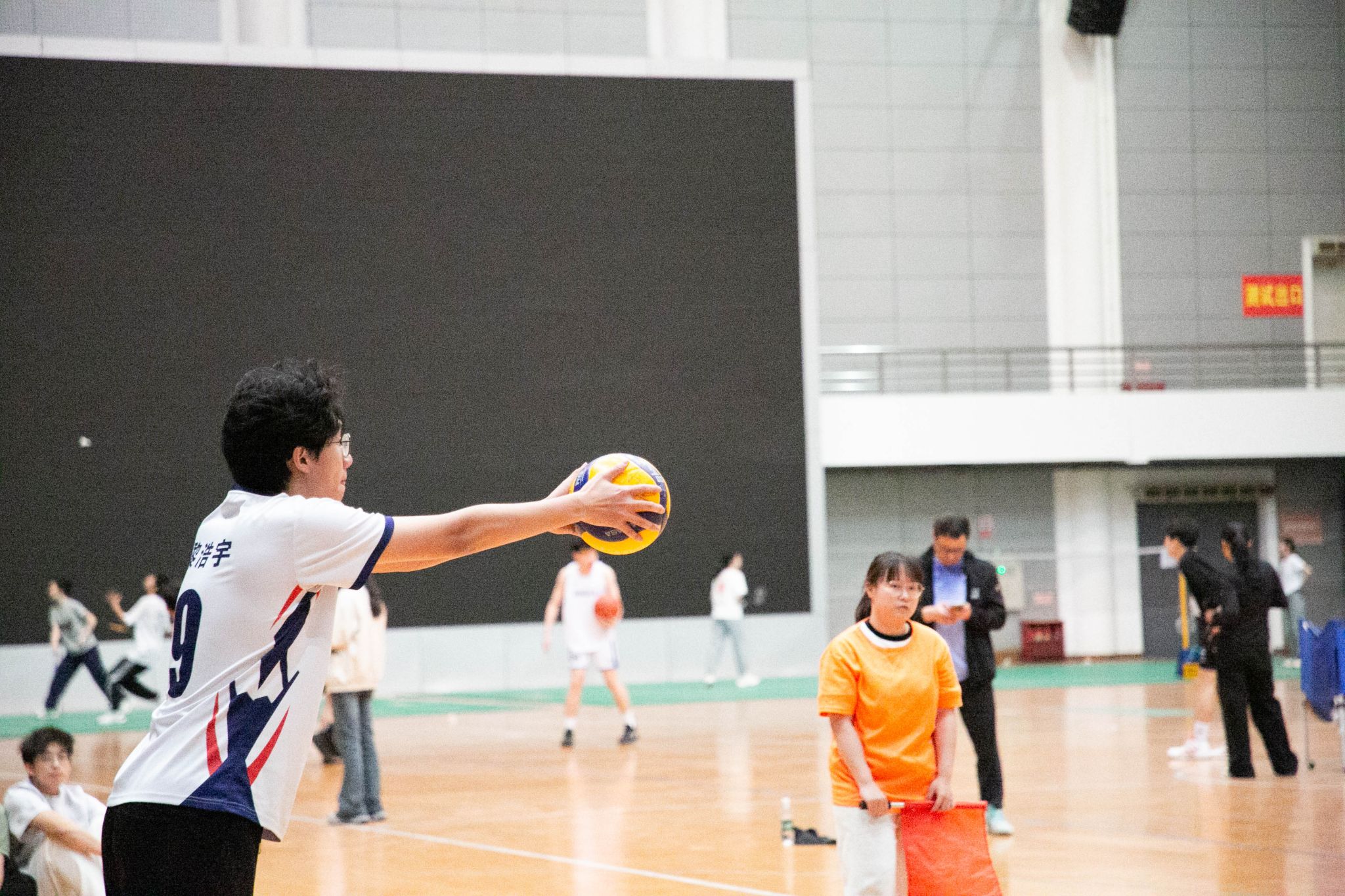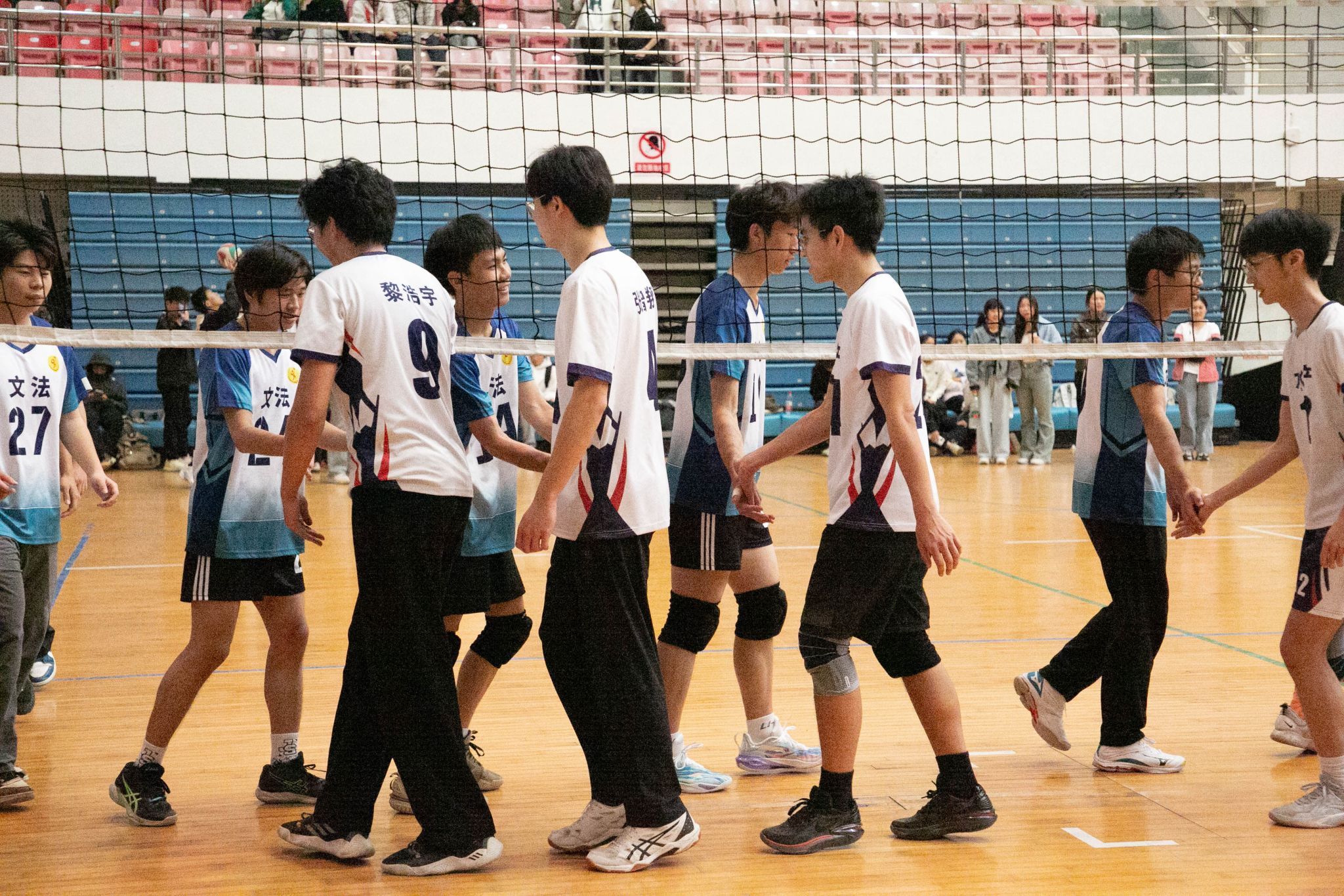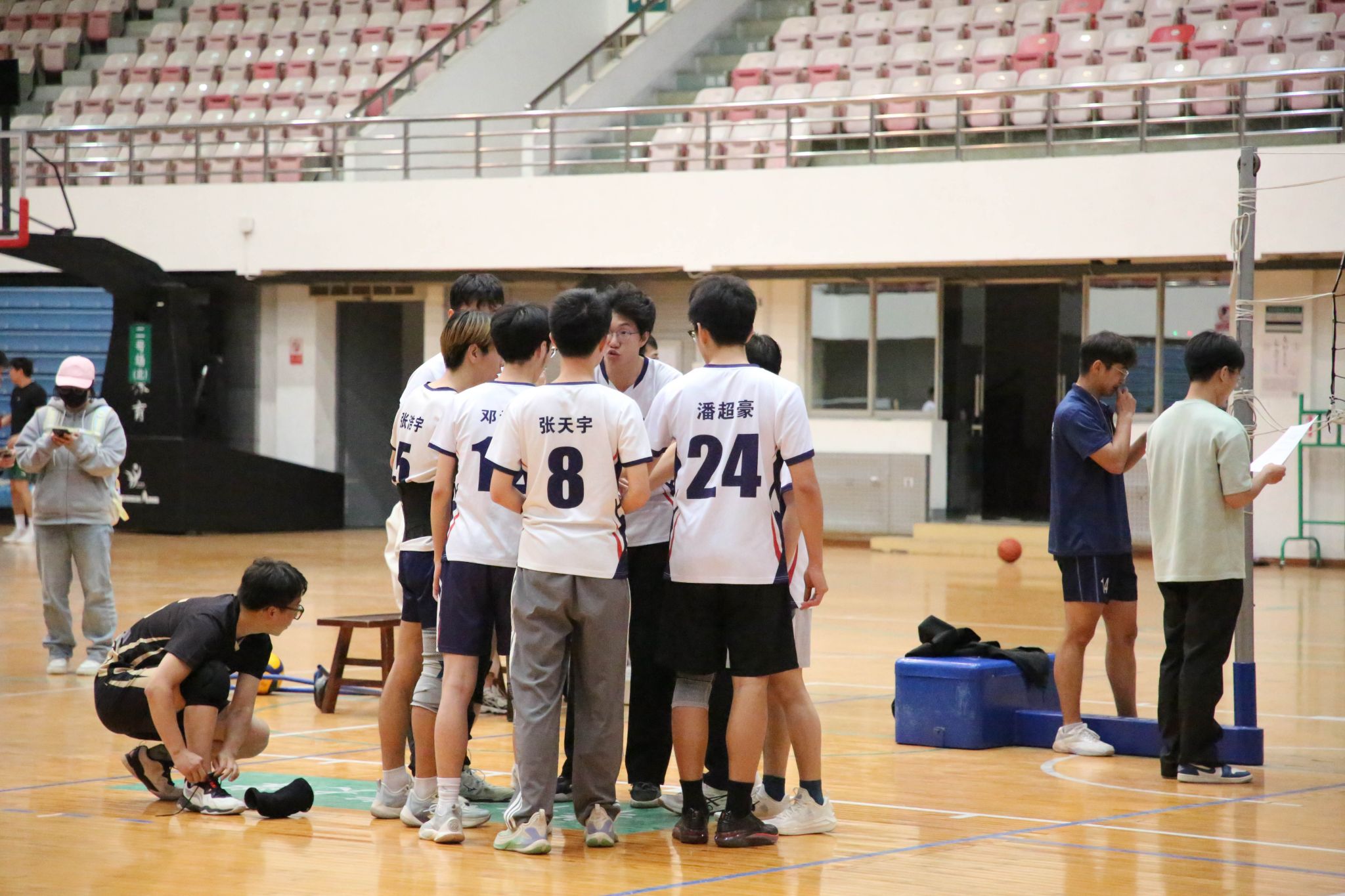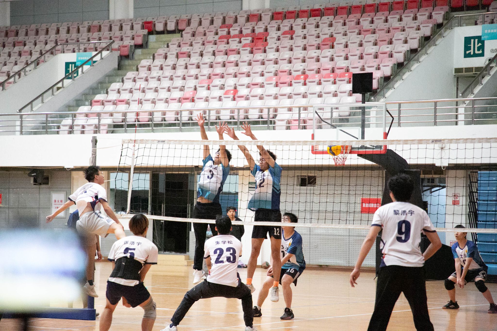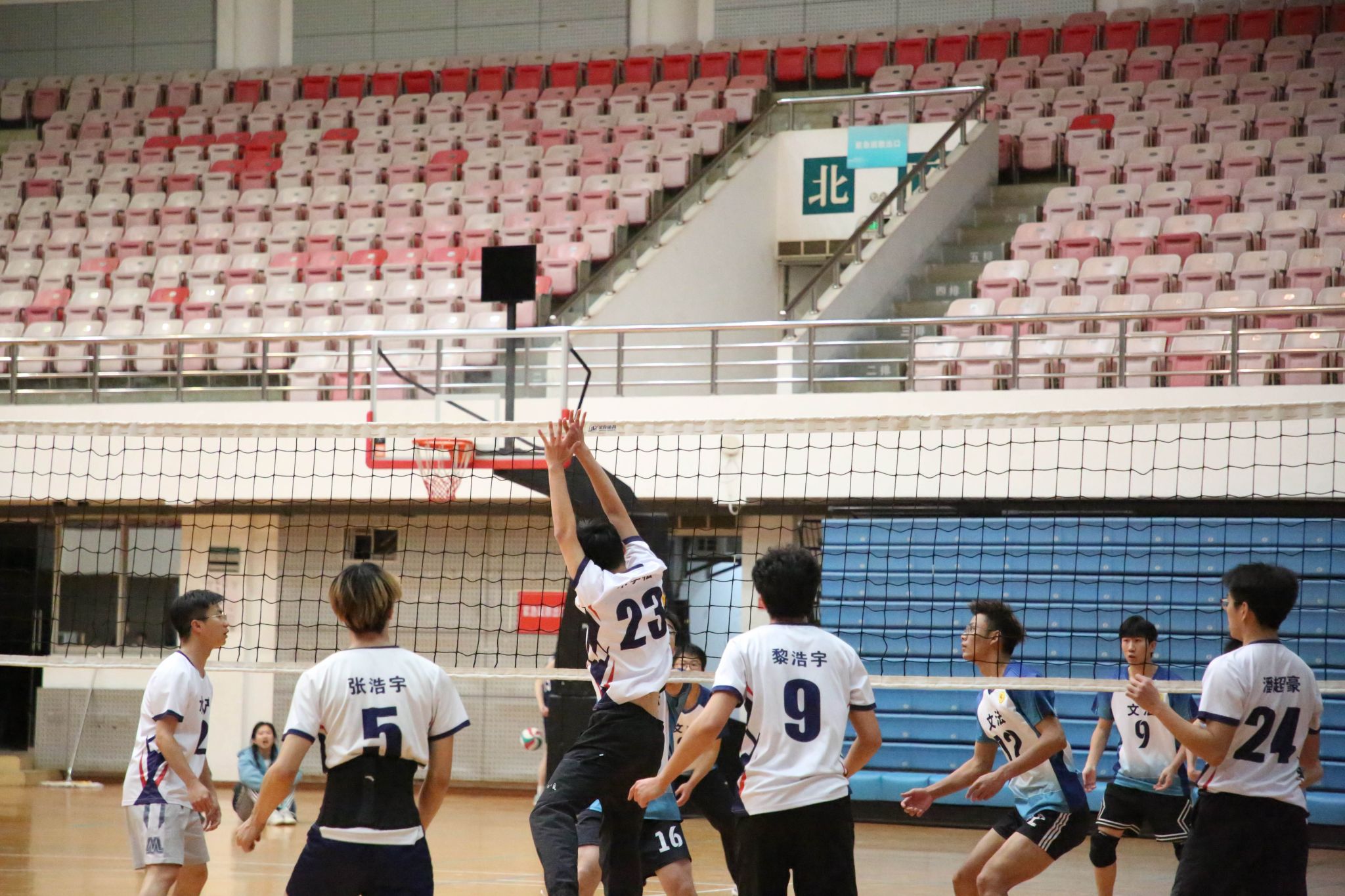 4月12日19点,pa电子官方网站2024年狮子山杯排球赛男子组5、6排位赛,于西体育馆顺利举行。本次交手的两支队伍分别来自pa电子官方网站和文法学院,主持人依次介绍双方队员及裁判员,双方球员握手致意。