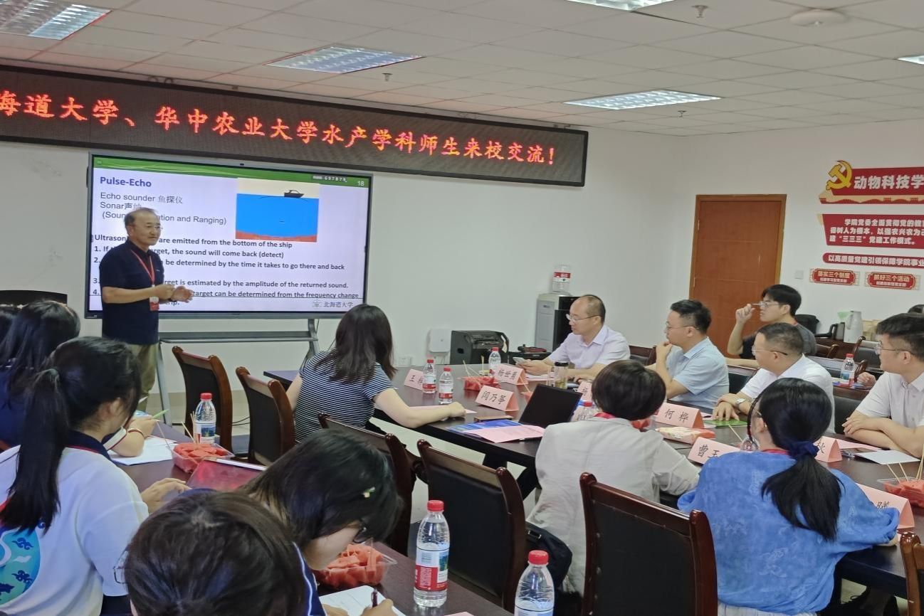 四川农业大学动物科技学院党委书记何桦进行致辞,向井徹教授、四川农业大学动物科技学院副院长杨淞教授等专家学者与中日三校的师生就两校特色水产研究方向,以及水产养殖、种质资源保护、营养饲料等共同关注的研究领域进行了深入探讨与交流。