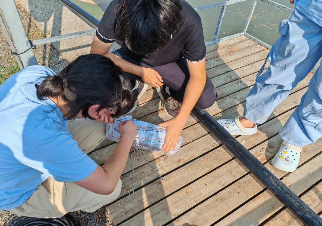 抵达当日,基地筹备鱼苗投放,前期基础设施检修是关键。队员与工人并肩作战,在烈日下检修增氧机线路、铺设管道、修补漏洞、检测水质,直到日落完成检修。