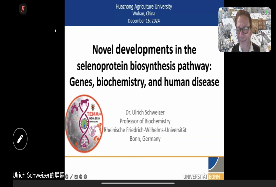 12月16日下午,pa电子官网2024年第23期(总412期)“水产讲坛”在线上举行,特邀德国波恩大学的Ulrich Schweizer教授作了题为“硒蛋白生物合成途径新进展:基因、生物化学和人类疾病”的分享。本次讲座由罗智教授主持。