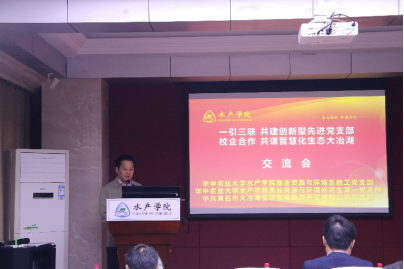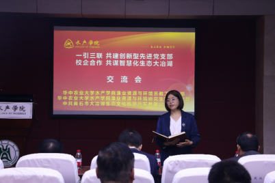 周琼书记简单介绍出席本次活动的黄石大冶湖文旅公司党支部党员骨干与学院领导与教师后,重点介绍了黄石市大冶湖文旅公司党支部“一引三联,共建创新型先进党支部:产业对接,共谋智慧化生态大冶湖”的党建工作思路和本次对接共建活动的目的和意义。曹玉琼代表学院致欢迎辞,对百忙之中参加会议的各位同志表示欢迎,并着重介绍了渔业资源与环境系师生长期在大冶湖开展的社会服务工作,提出党建工作要落实在工作、研究以及育人之中,以社会服务的形式促进行业的发展,实现党建业务的双丰收。渔业资源与环境系教工党支部副书记汤蓉同志带领大家重温入党誓词,黄石大冶湖文旅公司党支部委员领学党章部分章节内容,明确如何做一名合格党员。