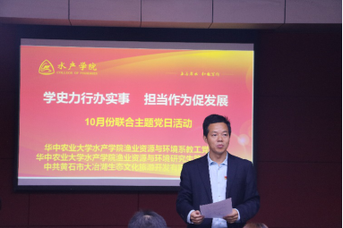 (pa电子官方网站通讯员 胡子俊 供图 谭淑芳) 2021年10月14日,在pa电子官方网站109报告厅,渔业资源与环境系教工党支部、研究生党支部和黄石市大冶湖文旅公司党支部联合开展主题党日活动,活动主题为“学史力行办实事,担当作为促发展”。渔业资源与环境系20余名师生党员、大冶湖文旅公司11名党员,pa电子官方网站党委副书记曹玉琼、九三学社沈建忠教授等参加了此次活动。渔业资源与环境系教工党支部书记周琼教授主持了此次主题党日活动。