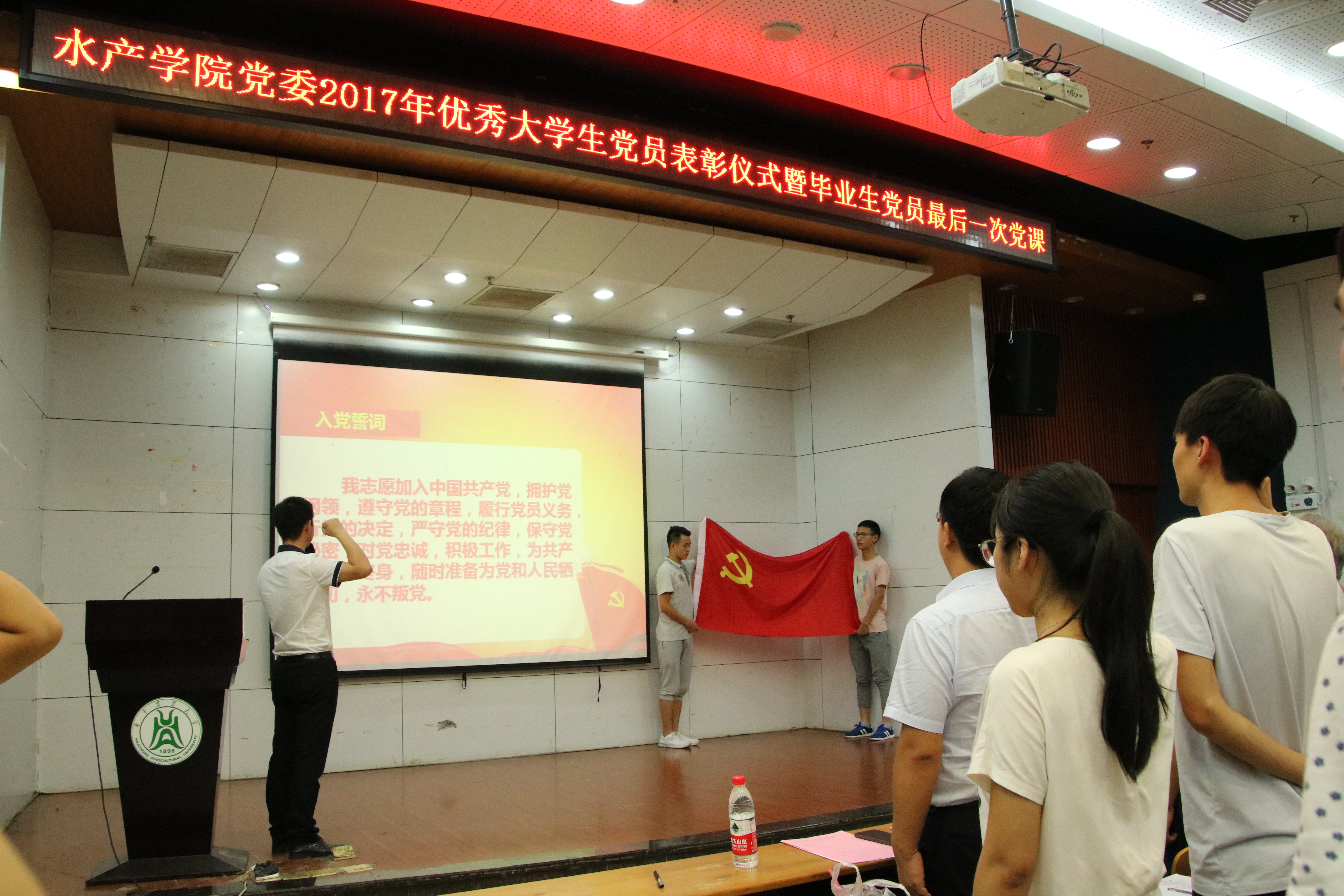 6月12日晚7点,pa电子官方网站党委2017年优秀大学生党员表彰仪式暨毕业生党员最后一次党课活动在大学生活动中心报告厅举办。学院党委书记张韶东,副书记刘广乐、组织员史维舟等出席活动,学院全体辅导员和全体党员参加了本次活动。