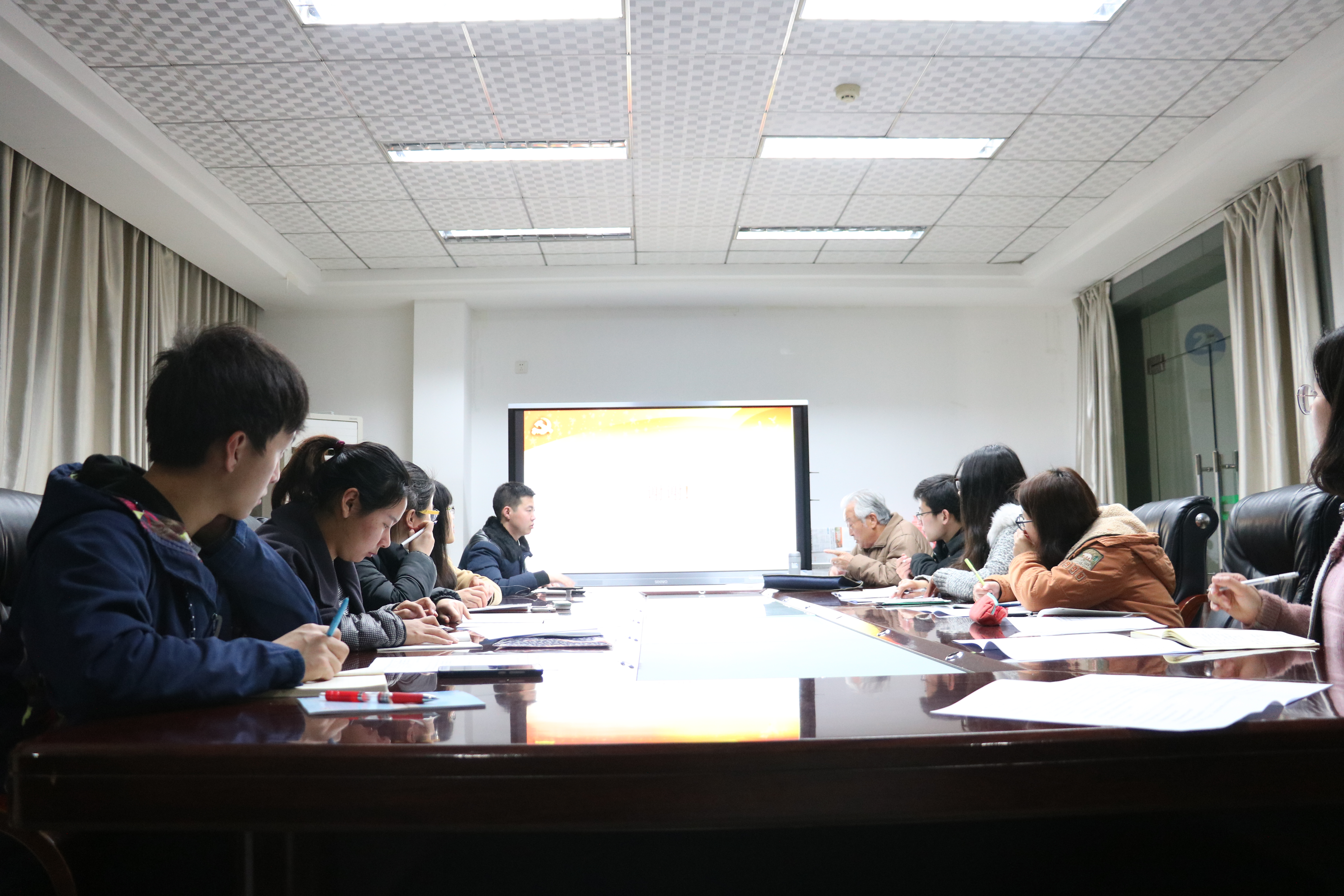辅导员蔡徐涵通过ppt介绍了从一名入党申请人,到入党积极分子,到发展对象,最终成为预备党员,正式党员所要经过的全部流程,对照文件,逐字逐句解读,并结合工作实际抠细节,定方向,做安排。在审议《发展党员工作方案(2016-2017-2)》时,他强调确定拟发展对象要认真、深入的考察,坚持客观公正和严实作风,要“红脸出汗,触及灵魂”。史维舟对发展党员工作方案进行补充强调,要求大家一定夯实“学”这个基础,抓好“做”这个关键,将党员教育管理、发展落实到位。