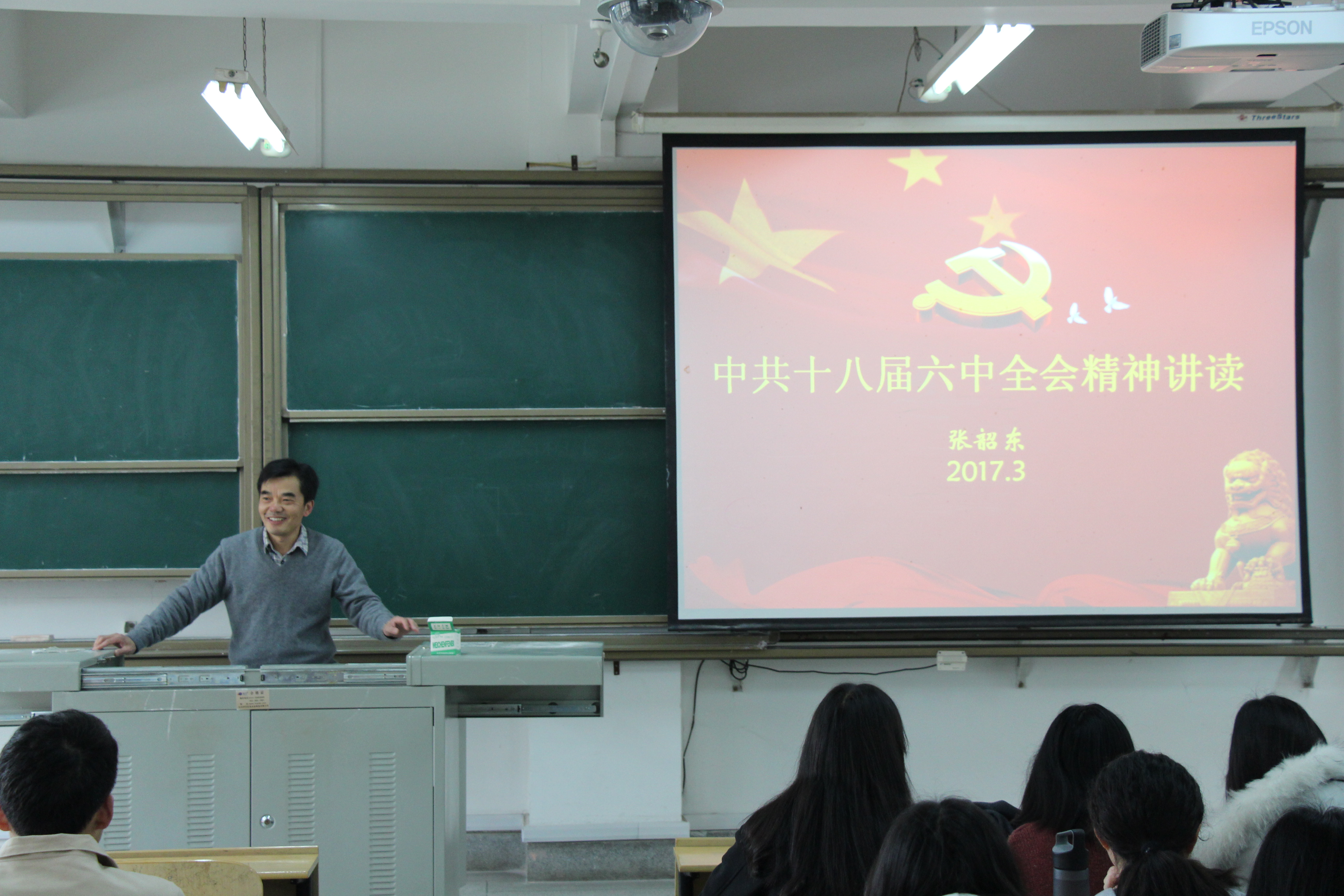 张韶东向大家“十八届六中全会精神的讲读”的专题报告。首先,他带领大家回顾了十八大以来党协调推进“四个全面”战略布局的情况,介绍了我党召开的历次重要会议和重要举措。接着,他介绍了十八届六中全会的召开情况和重要成果。重点解读了《关于新形势下党内政治生活的若干准则》《中国共产党党内监督条例》两部党内法规。《准则》继承了党的优良传统,集纳了党的创新成果;《条例》则以党章为根本依据,具有坚持问题导向,将继承和创新有机统一,体现了约束和激励机制相结合等特点。在此基础上他还解读了我党的“四自”传统。“四自”使中国共产党具有强大的生命力,是管党治党的优良传统,是区别于其他政党的显著标志,是中国共产党永立不败之地的法宝。他希望大家在“严紧硬”的背景下,不断增强“四个意识”,倡导“三严三实”,坚持“两学一做”,不断提高自身党性修养。