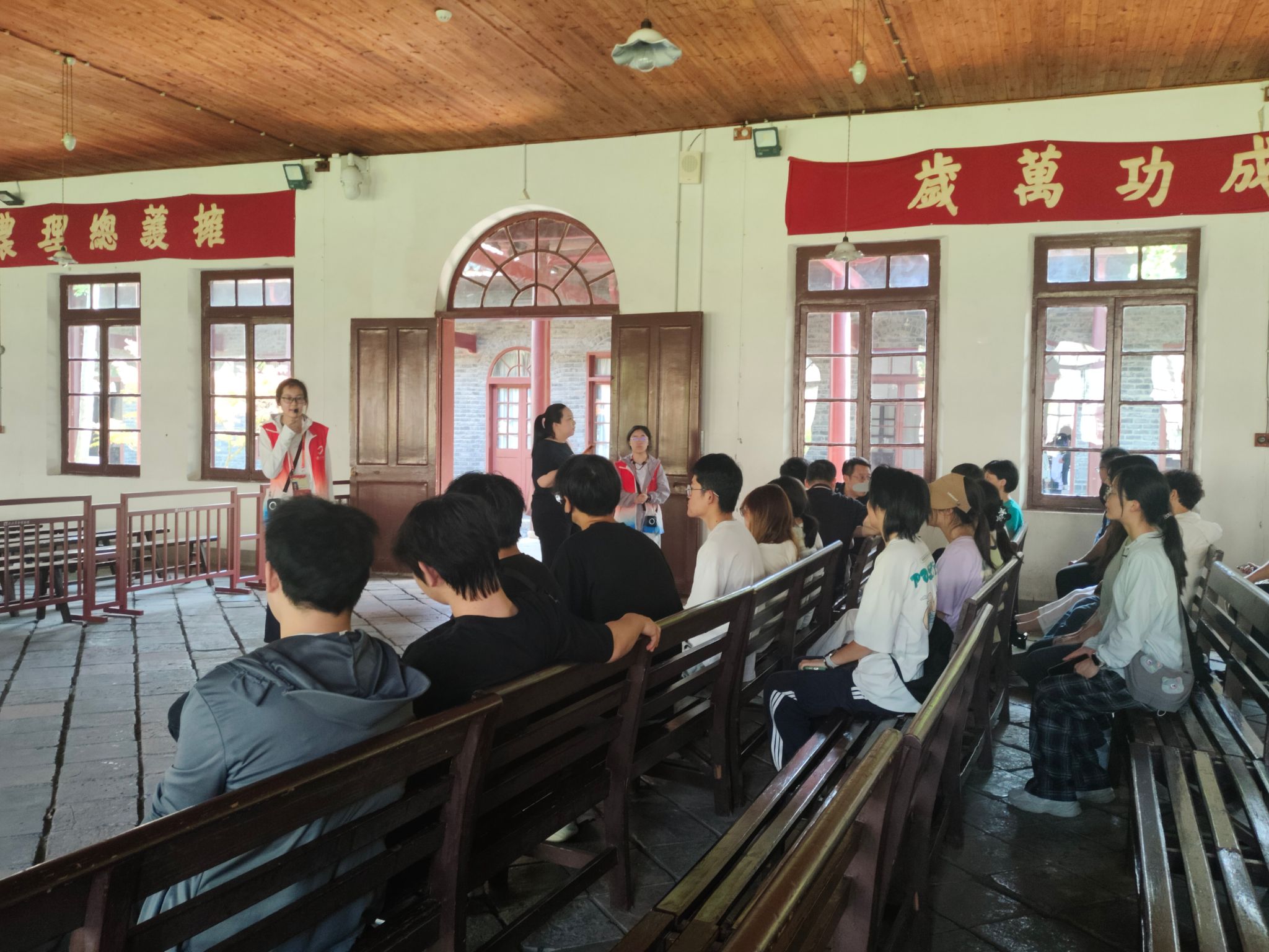 支部党员在农讲所大课堂聆听志愿者讲解(邱思雨 段振玲摄)