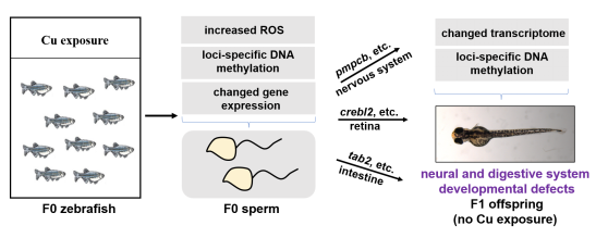 本团队使用国家渔业水质标准(GB11607-89)对铜浓度要求的上限(10 μg/L)胁迫成年斑马鱼,发现雄性斑马鱼在铜胁迫后其子代胚胎存在神经和消化系统发育缺陷。机制上,铜诱导的精子DNA甲基化和基因转录水平的改变可以传递给它们的后代,重新编程胚胎发生过程的表观遗传和转录调控并导致胚胎发育缺陷,这表明环境相关浓度的铜可能对鱼类的可持续性构成巨大威胁。