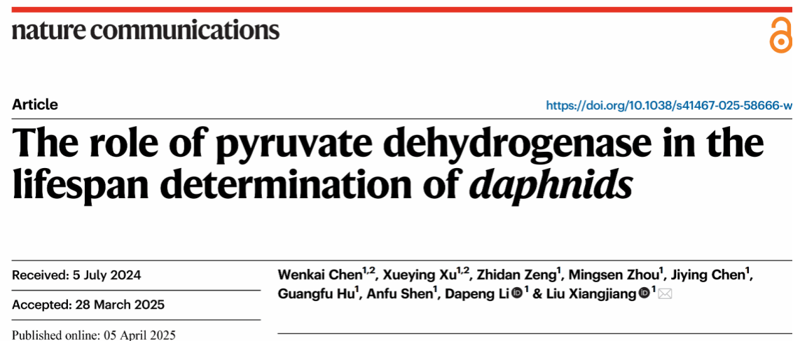 近日,pa电子官网pa电子官方网站李大鹏教授领衔的鱼类环境生理与健康养殖团队刘香江课题组在Nature Communications期刊上发表题为“The role of pyruvate dehydrogenase in the lifespan determination of daphnids”的研究论文。该研究通过解析枝角类模式生物的代谢进化策略,发现丙酮酸脱氢酶(pyruvate dehydrogenase,PDH)活性的降低是延长寿命的关键因素之一,为揭示能量代谢与寿命调节的关键分子机制提供了新见解。