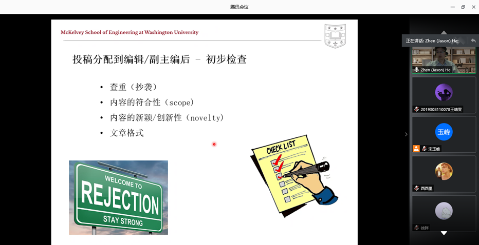 (pa电子官方网站通讯员 郑建铎 供图 郑建铎)7月30日上午,pa电子官网第20008期水产讲坛学术活动通过腾讯会议在线上举行,美国圣路易斯华盛顿大学的贺震教授作题为“如何发表高水平科研论文”的报告。贺震教授目前担任多个期刊的主编、共同主编,拥有丰富的审稿经验,了解审稿的流程。本次报告面向全院师生,由学院教授罗智主持。