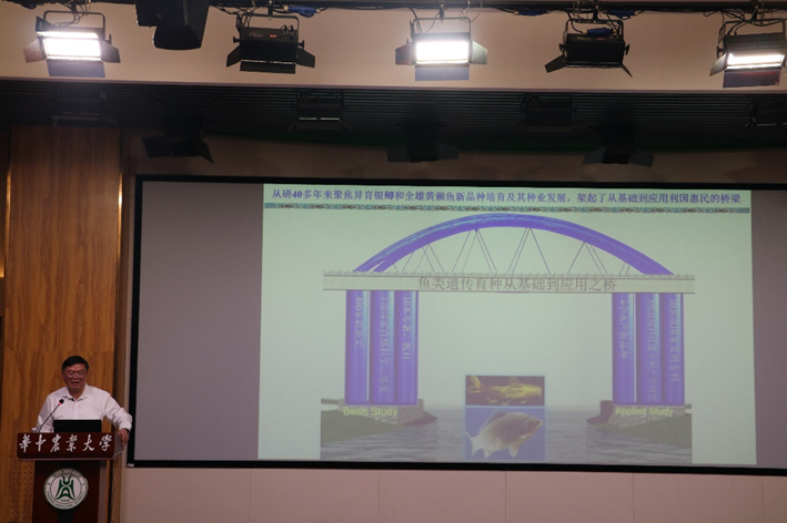桂建芳从事研究40多年来始终聚焦异育银鲫和全雄黄颡鱼新品种培育及其种业发展,最终架起了从基础到应用利国惠民的桥梁。由此形成了异育银鲫从亲鱼培育、苗种生产到鱼种培育的水产种业创新链和价值链,推动了鲫鱼养殖产量增长和可持续发展。接着,他介绍了现代水产遗传育种的兴起与发展,并指出中国和国际上近年来对水产品、水产种业的高度关注和支持。同时,他讲述了水产育种技术和理论的进步与创新,并详细介绍了五条鱼类精准育种技术路径。